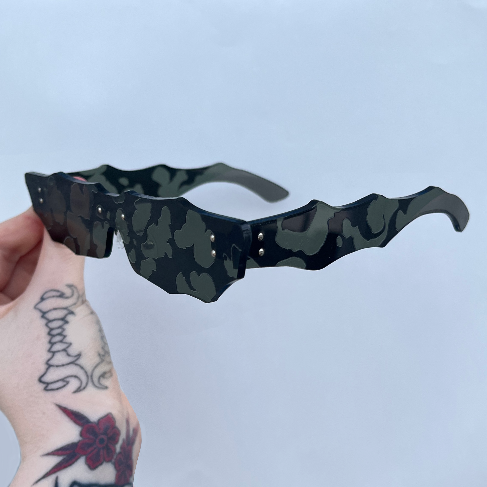 Asymmetrically patterned grey and black sunglasses with a ripped and torn design